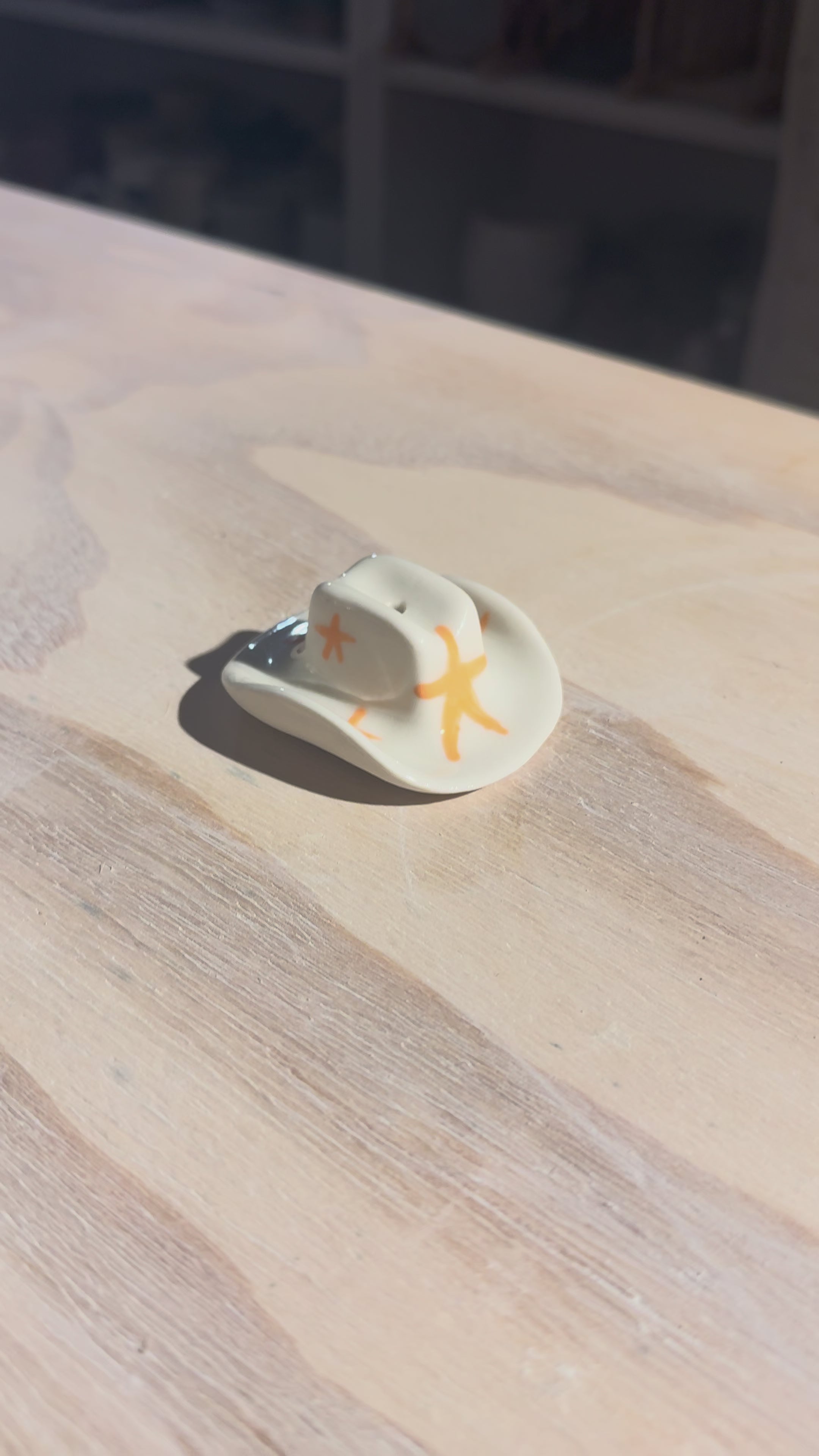 Handcrafted from stoneware clay, this incense holder reinterprets the classic cowboy hat with a playful, sculptural touch. Whitestone ware - Painted by hand.